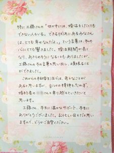 婚活期間が長くなり、あきらめそうになることもありましたが、工藤さんのその言葉を思い出し、頑張ることができました。