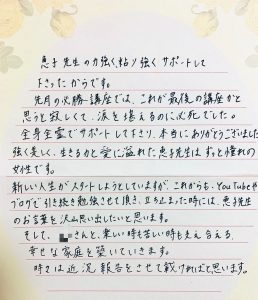 これからもYouTubeやブログで引き続き勉強させて頂き、立ち止まった時には恵子先生のお言葉を沢山思い出したいと思います。